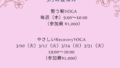 | 持ち物 | ・ヨガマット ・飲み物 ・必要に応じてタオルなど |